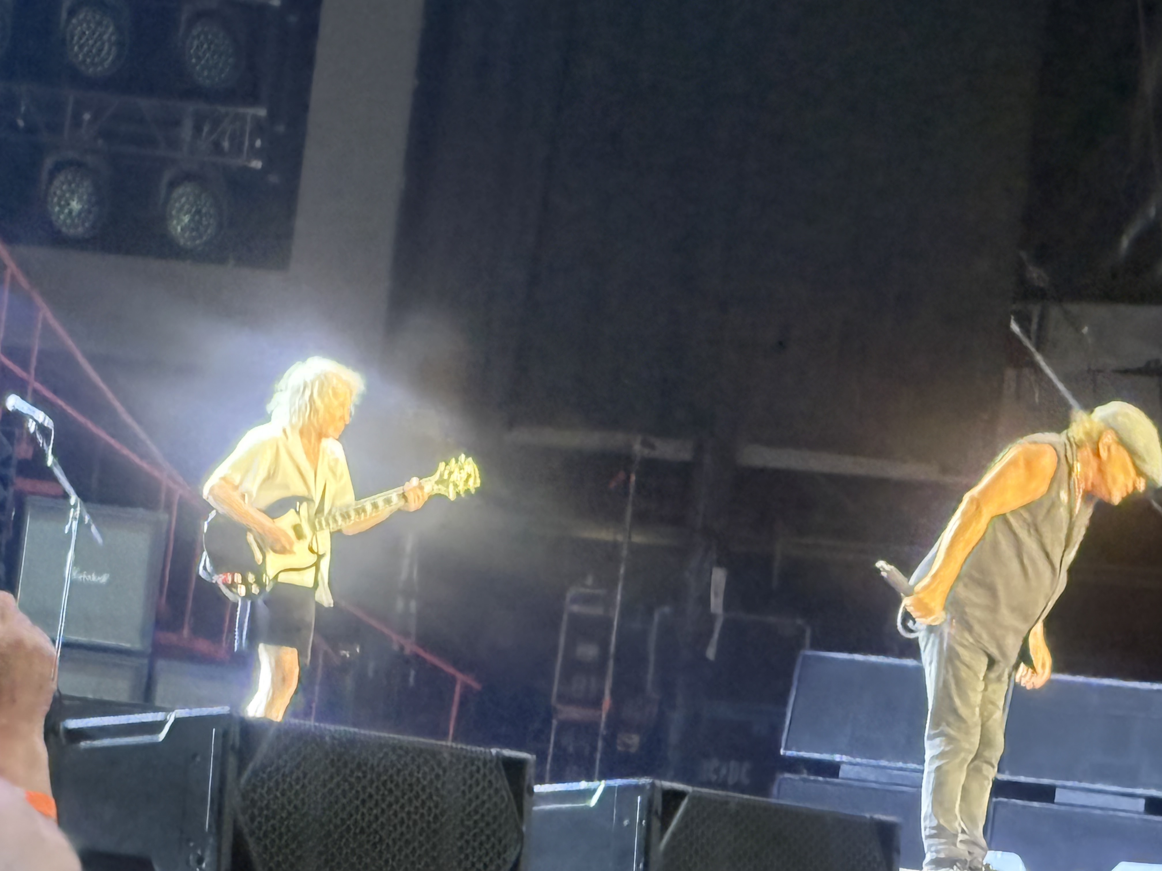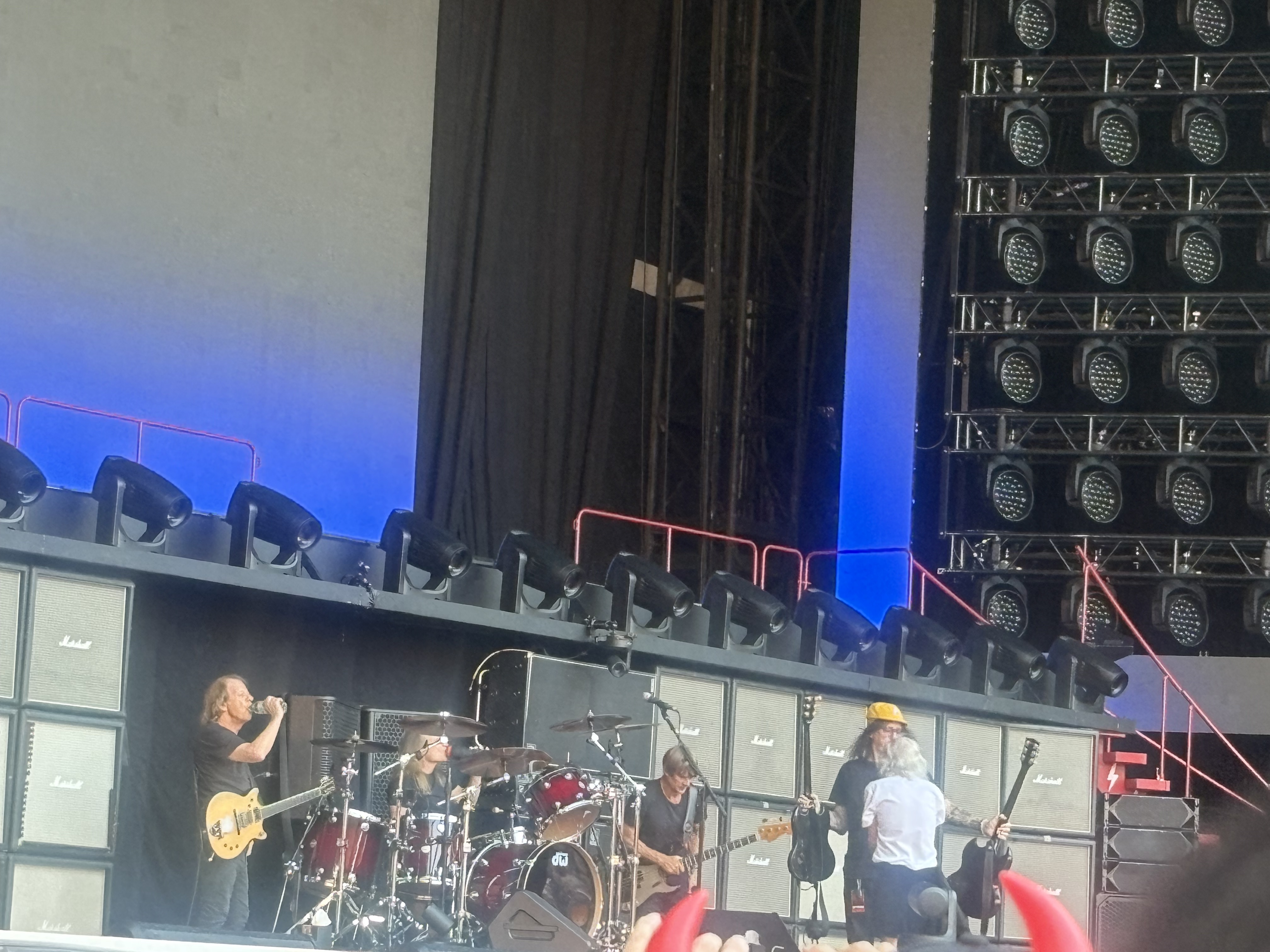 Première partie, que finalement j’apprécie mieux qu’à Dublin. Je prends un gros plan de la culotte de la chanteuse car Jul’ m’avait supplié de lui envoyer. Fin de la première partie, installations sur la scène, et début du générique que vous connaissez tous. Un régal d’être si bien placé sur scène, je ne vais pas refaire le retour de la petite méforme d’Angus et des plantages sur certains morceaux, compensée par son implication et son énergie scénique, ni sur la grande forme et le bonheur affiché de Brian, l’excellente prestation de toute la section rythmique.